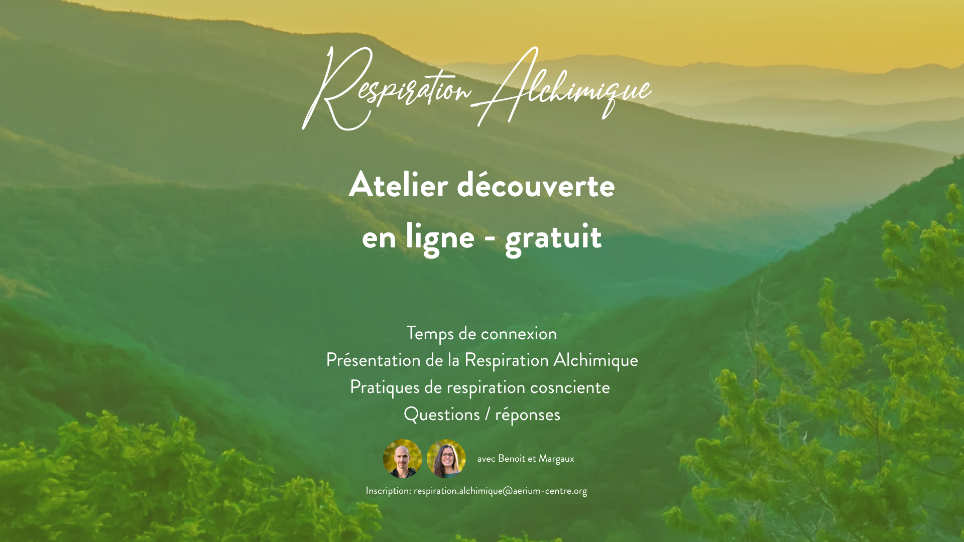 L’atelier découverte de la Respiration Alchimique, c'est un rendez-vous pour une connexion profonde à vous-même. Cet atelier est offert — un véritable cadeau pour découvrir la puissance de votre souffle. Respirer pleinement, c’est vous offrir plus de vie à chaque inspiration. Ne manquez pas cette occasion de vous reconnecter à votre souffle et à votre vitalité...